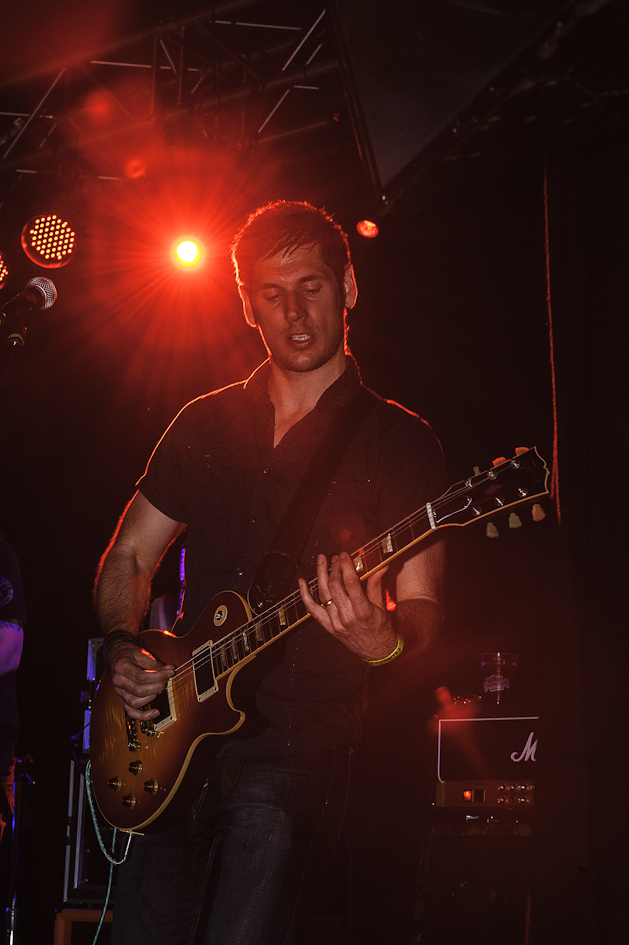 Six Bullet Chamber, to which my youngest son plays lead guitar and writes a good deal of the music were, thankfully, first on! I situated myself toward the front of the stage in order to get a decent, audience free, shot of my son just before the opening bars of their first ditty, culled from their latest CD,"Interpretation" wafted from the multitude of amplifiers.The instantaneous energy released from the speakers at that point encouraged my denim trousers to flap. I had thought that these jeans would be trendy, though I soon realised that darning the wear hole on the knee, as I had done to deter further damage, just didn't "cut-it" with the, generally, younger members of the audience who seemed to delight in exposing various parts of their torso's from what appeared to be self inflicted vandalism to their apparel. Not to be deterred from the soon to become overpowering odour of young males who hadn't appreciated the benefits of good hygiene, I stayed near to the front to record as many images of my son and his chums as they rattled, mercifully, through a shortish set before my wife and bade farewell to him, his friends and the various individuals in the audience whose uniform colour tones of drab black, coupled with skin tones the pallor of which suggesting a nocturnal life, situated mostly at zone 1 or zone 9 - they would have had Ansel pre-flashing methinks!